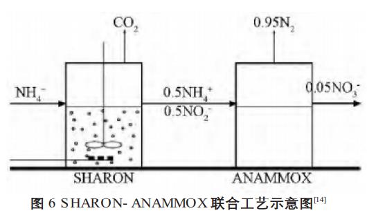 SHARON工藝的基本原理是短程硝化反硝化。該原理與傳統(tǒng)硝化反硝化的區(qū)別在于將氨氮氧化控制在亞硝化階段直接進行反硝化,使得反應時間縮短,除磷效果提高。厭氧氨氧化工藝中,由于厭氧氨氧化菌是自氧菌無需外加碳源,大大降低了硝化反應的充氧能耗。因此將SHARON工藝作為硝化反應器,ANAMOX工藝作為反硝化反應器形成組合工藝,工藝圖如圖6。該工藝適用于處理高氨氮濃度廢水,此工藝與傳統(tǒng)工藝相比反應時間短,能耗低,產(chǎn)泥量少。